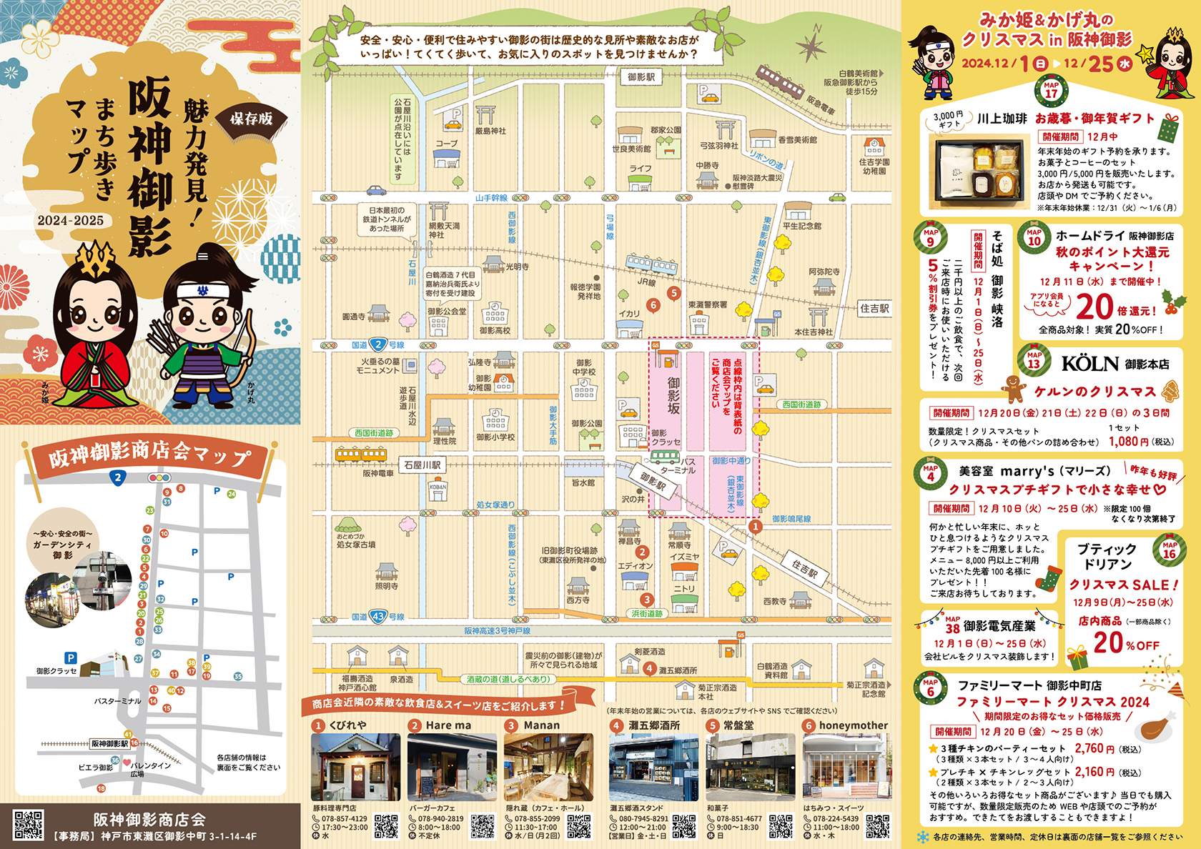 みか姫&かげ丸のクリスマス2024 in 阪神御影&商店会マップ発行 「みか姫&かげ丸のクリスマス2024 in 阪神御影」開催! 【イベント期間】2024年12月1日(日)~25日(水) 期間中、御影坂はクリスマスイルミネーションが点灯し、各店でクリスマスキャンペーンを実施! 会員店ではイベント情報付きの最新マップを配布しています。 近隣の素敵なお店も紹介していますよ~♪