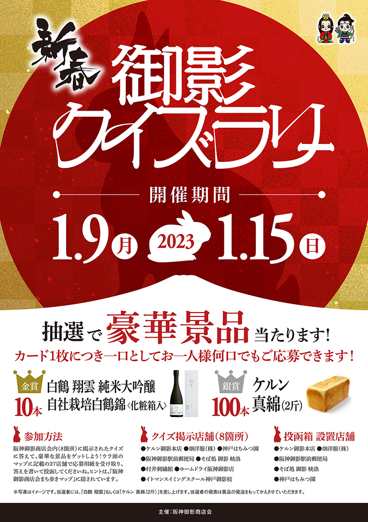 阪神御影商店会内の対象店舗等で異なるスタンプ3つ集めて豪華賞品が当たる抽選会。